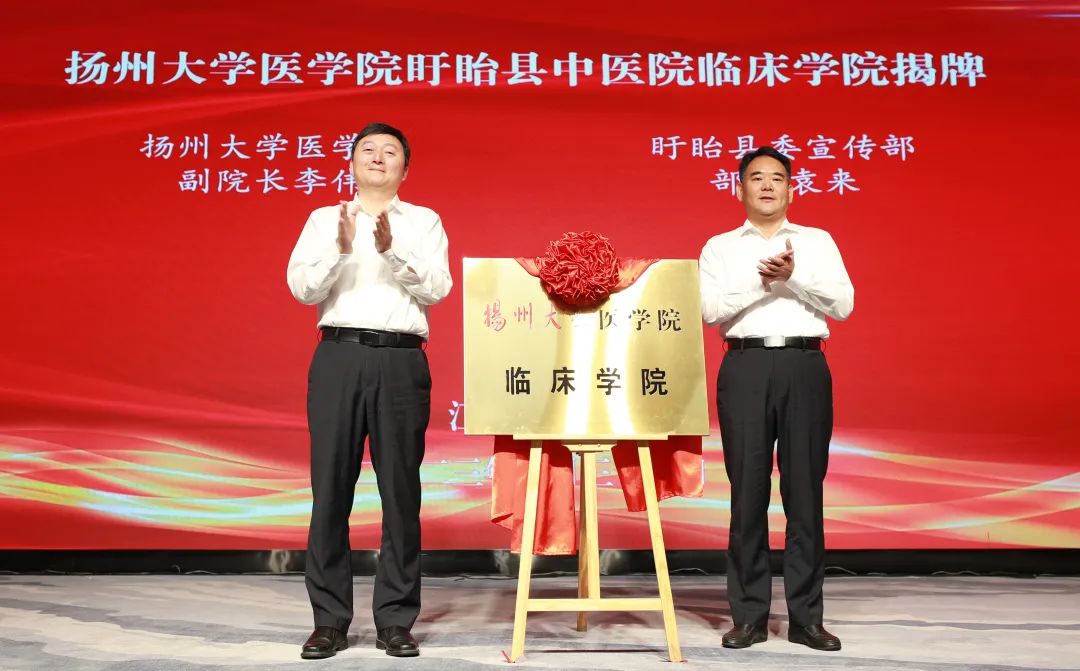 △扬州大学医学院副院长李伟和盱眙县委宣传部部长袁来为扬州大学医学院盱眙县中医院临床学院揭牌