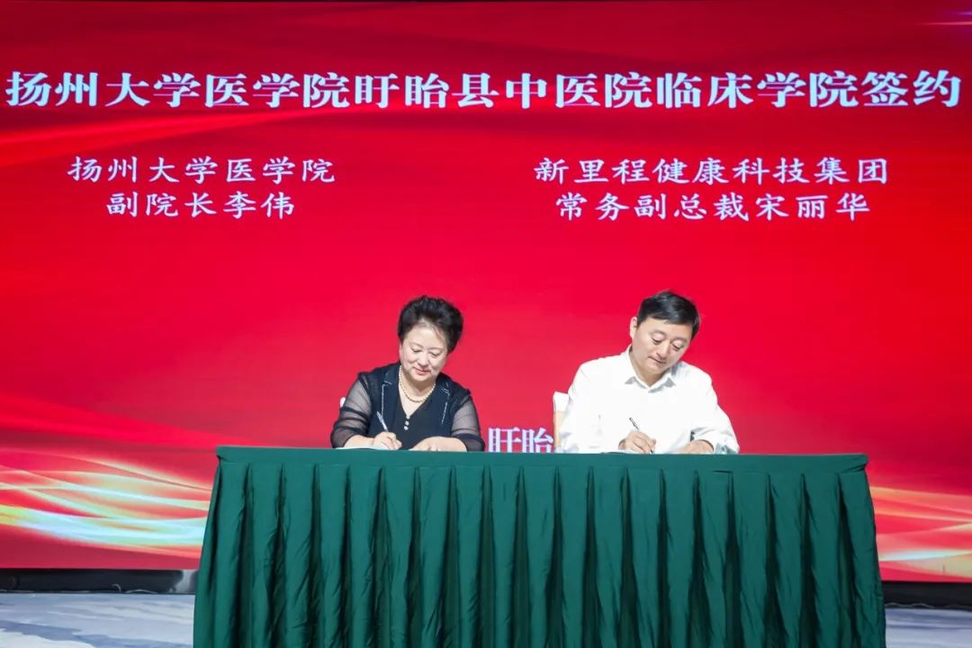 扬州大学医学院副院长李伟与太阳集团tcy8722健康科技集团高级副总裁、盱眙县中医院董事长宋丽华签署院校合作协议,并与盱眙县委宣传部部长袁来共同为扬州大学医学院盱眙县中医院临床学院揭牌。