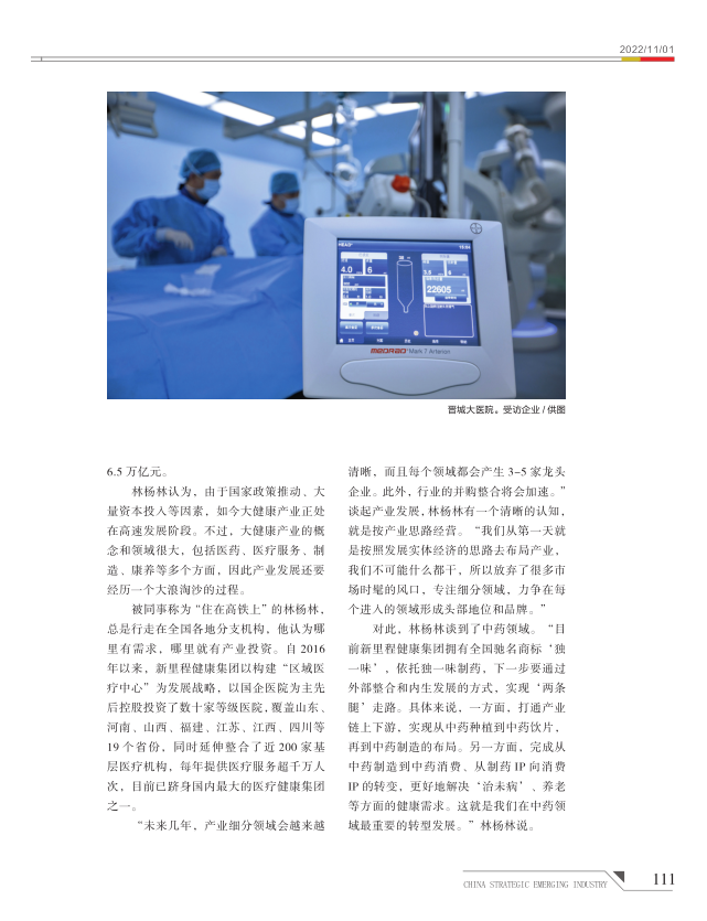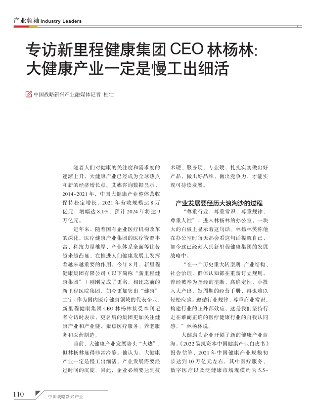 《中国战略新兴产业》2022年11期刊发了《专访太阳集团tcy8722健康集团CEO林杨林:大健康产业一定是慢工出细活》。